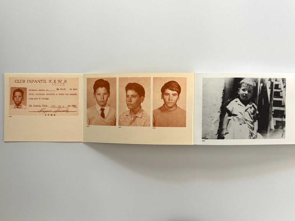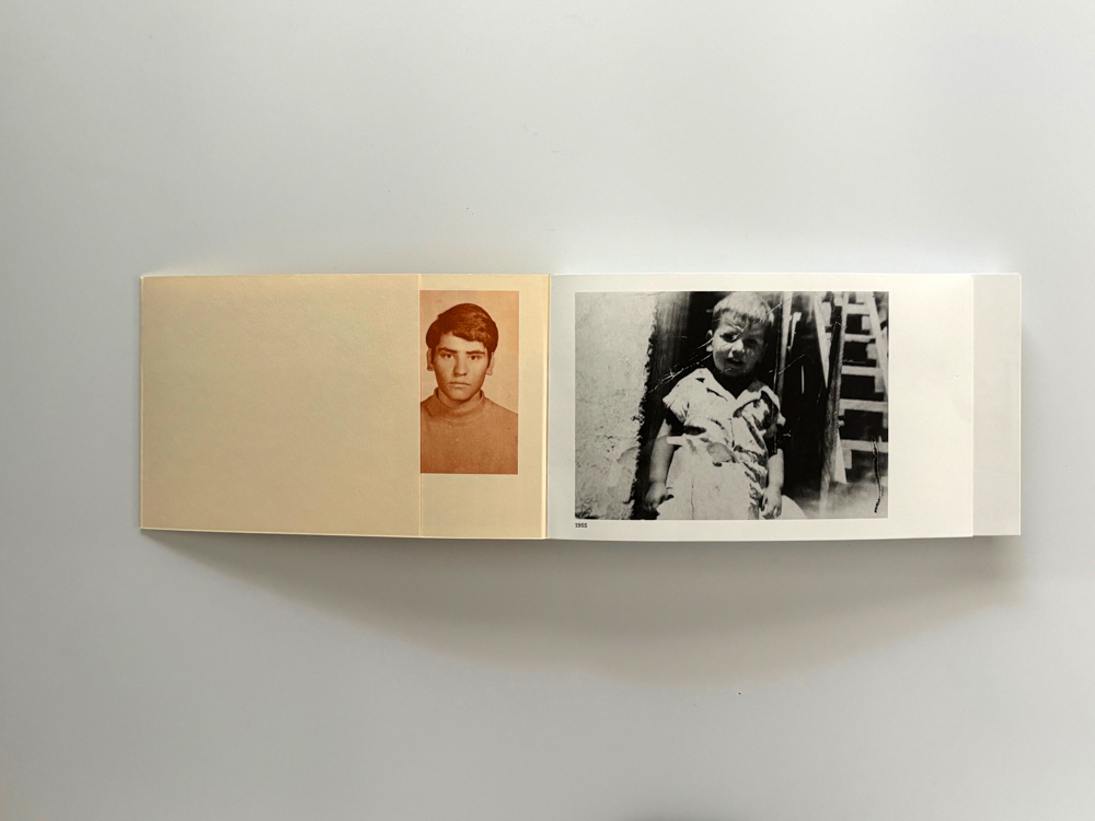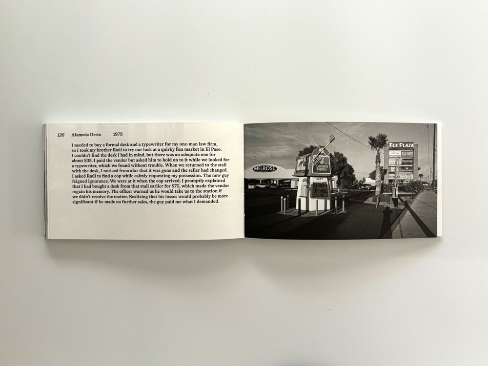 I’m thinking of page 74 as an example: a wide pavement and a wide road, a few cars, and a sign for the Rio Grande department store. The only text opposite is the page number and the road name, ‘East San Antonio Avenue’. I know it has a place in your father’s story, but without words, I don’t know what it is. The picture feels slippery, and it reminds me that for how finished images appear, they often wait for words to complete them. It’s Barthes again, although I’ve always thought that his idea of latent meanings feels too passive, and underplays how images can be filled with meaning (a dangerous thing), and then hammered into shape.